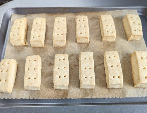 6.生地に穴を開けて、170℃に予熱したオーブンで22分くらい焼き、天板で冷ます。