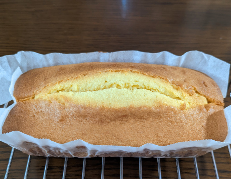 8、焼き上がったら熱いうちに型から出し、オーブンペーパーも外しラップをかけて冷まして出来上がりです。