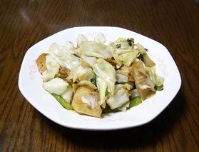 沖縄でキャベツ料理の代表的なメニューが、豚肉と豆腐、削り鰹と塩醤油で味付けし、ネギをちらしたタマナーチャンプルーでしょう。今回は、豚肉の代わりにチキアギー(サツマアゲ)と、ネギの代わりにカラシ菜を彩りにしたタマナーチャンプルーです。 豚肉の代わりにポーク缶詰でもOK、美味しくて手軽な一品です。