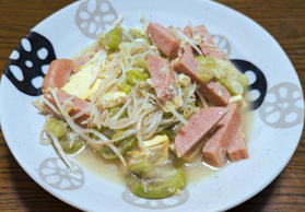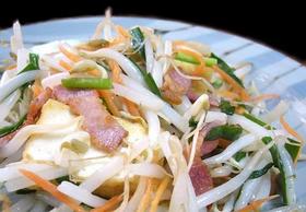 マーミナは方言でモヤシの意味です。チャンプルーは豆腐と豚肉に卵などと野菜を加えた炒め料理で、野菜の名前にチャンプルーを付けてその料理とする。チャンプルーにしやすい野菜はマーミナやタマナー、ゴーヤー、ナーベーラーなどなど。もやしは淡色野菜に分類される。緑豆はデンプン、大豆はタンパク質といった、それぞれの豆特有の栄養素を保持しながら、発芽時にビタミンCやアスパラギン酸が生成されて栄養価が向上する。また、発芽時に消化酵素のアミラーゼも生成されるため、糖質の消化も助ける効果も期待できる。(ウィキペディア)