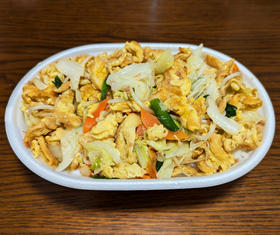 フータシヤーならぬフーチャンプル、車麩と卵に野菜を加えて炒めます。チャンプルーの定義と言われる豚肉と豆腐は入ってませんが、車麩がその代わりをしています。チャンプルーは、沖縄の代表的な家庭料理の一つです。「ごちゃまぜ」という意味の沖縄方言で、さまざまな食材を炒め合わせた料理を指します。沖縄の食文化に深く根ざしており、日常の食卓に欠かせない存在です。