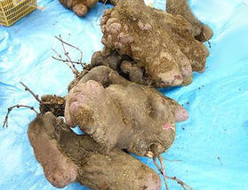 別名のトゲドコロは、トゲのある蔓(つる)からと言われます。蔓のトゲや細かい根がびっしりとあるため、手入れや掘り出して後の土落も大変で、そのため沖縄で生産する農家は少ないと聞いています。