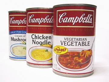 赤と白の缶のデザインは、1960年代のアメリカを代表するポップアートの芸術家・アンディー・ウォーホルの作品「キャンベルのスープ缶」の素材となった ことで有名。この缶を題材とし、1962年から1968年にかけて描かれた因習打破的な一連の絵画は、その多くがペンシルベニア州にあるアンディー・ ウォーホル美術館(ピッツバーグカーネギー美術館)に展示されている。日本においては、キャンベル・ジャパンとSSKセールスを通して 日本向けに味を調整した製品が数種類発売されているほか、都市部の輸入食料品店ではオリジナルの各種スープが販売されている。また、沖縄県では米軍統治時 代から家庭の常備食として広く親しまれており、特定の銘柄については米国とほとんど変わらない価格(1缶数十円程度)で購入することが可能である。