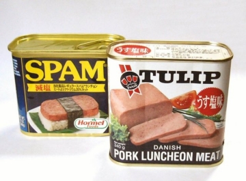 迷惑な電子メールをスパムメールといい。このスパムメールの語源は、スパム・ポークランチョンミートからきていると言われてます。また、ランチョンミートの由来は、この種の缶詰ソーセージがしばしば昼食ランチのメニューに用いられたことからランチョンミートの名が定着したらしいです。ポーク缶詰が豚肉の代用品として豚肉の好きな沖縄の人の生活に広まり、今や沖縄料理では欠かすことのできない食材となりました。 沖縄県で販売されている製品はアメリカ、デンマーク、オランダ、中国など各種ありますが、スパムとチューリップが人気。