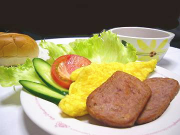 沖縄の食卓を一変させたといって過言でないポーク、その代表的なメニューが「ポークタマゴ」。 玉子焼きと炒めたポーク、ありあわせの野菜を添えて簡単に出来るのが嬉しい。 家庭では朝の忙しい時間に手早く出来るので、よく言えば合理的、悪く言えば手抜きの一品。しかし、何と言われようと、とても重宝するメニューであることはたしかです。タマゴは、目玉焼き、スクランブルどちらでもお好みでOK。 写真は、スープとパンをそえてますが、ご飯と味噌汁でも美味しいですよ。