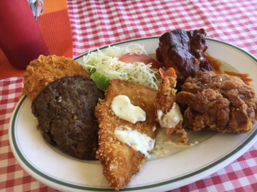 沖縄のレストランや食堂の定番メニュー代表がAランチ。 プレートに盛りつけた料理が食欲をそそります。 その発祥は、ニューヨーク帰りのシェフが1956年にコザ市(現在は沖縄市)にオープンした「ニューヨークレストラン」で考案されたメニューが各地に広がっていったと伝わります。