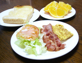 ベーコンエッグ(bacon and eggs)の卵は目玉焼き(sunny-side up)か、両面焼き(over-easy egg)が定番ですが、私は溶き卵焼き(scrambled egg)が好み。フライパンにベーコンを入れて弱火で熱し、油がベーコンから染み出し、ベーコンが炒まってきたところで生の鶏卵を割り入れ、ベーコンの油や欠片をかけながら卵が好みの状態になるまで熱する。余分な卵の焦げ付きを防ぐために、フライパンの熱を少し下げておく必要がある。