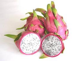 ドラゴンフルーツ (dragon fruit) 、またはピタヤ (pitaya)とも呼ばれています(ピタヤは本来サンカクサボテンの果実の総称)。 原産地は中南米で、サボテン科ヒモサボテン属のサンカクサボテンの果実。 大きさは小さいもので女性の握りこぶしくらいで、大きいものは男性の拳くらいです。 果皮は鮮やかな赤に近いピンク色で果肉の色は白と赤がよく見られる。果肉はゼリー状で黒い種子が胡麻粒のように全体にあるため、果肉と種子を分けることは出来ない。 そのため種子を果肉ごと食るので、食感はシャリシャリとした感じです。ドラゴンフルーツは赤い果肉のものや、果皮の色が黄色い種類もある。