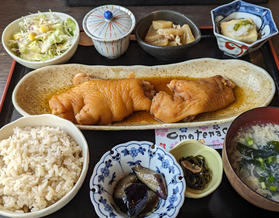 左画像は某食事所で出されているテビチの定食、柔らかく煮込まれていて味付けも良くとても美味しい。