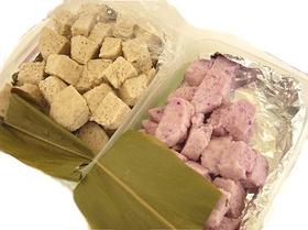 沖縄の「くずもち」。 葛餅は一般的に「くず粉」と呼ばれるものを原材料にした和菓子ですが、昔ながらの沖縄の「くずもち」はウムクジ(芋くず)と呼ばれるサツマイモのデンプンや、キャッサバのデンプン(タピオカ)を使うのが特徴です。現代では純くず粉を原料にしたものや、ウムクジ(タピオカも含む)を使用した葛餅が販売されている。 ちなみにくず粉は、秋の七草のつクズ(マメ科のつる性多年草)の根からとったデンプン粉で、デンプン類では高級品と聞いています。写真の「くずもち」は、ウムクジ(芋くず)と黒砂糖、きな粉を材料にしたもの。 作り方はかなりアバウトですが、ウムクジと水2対1、別鍋にザラメ糖に黒砂糖を少し加えてほぼ同量の水を入れて火にかけ、砂糖水をつくります。 そこへ溶いたウムクジを加えて煮詰め、香り付けに生姜汁を少し入れます(生姜汁は無しでも良い)。 焦がさないようシャモジでとろみと艶が出るまでかき混ぜます。 きな粉をふった型に流しいれ、常温で冷やし固めます。 固めた後は型から取り出し、一口大の大きさに切り分けます。 少しプルンとした食感にあっさりとした甘み、きな粉の香りがたまりません。