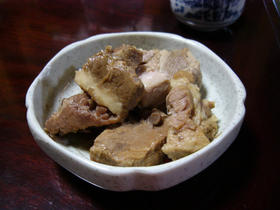 別の鍋にだし汁、醤油、砂糖、泡盛、生姜を入れて煮汁を作り、そこへ切った豚肉を入れ、始めは強火5~6分、後は弱火にして煮込んでいきます(1~2時間くらい、箸でちぎれるくらいになるまで)。