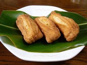 焼き饅頭、または焼き菓子ともよばれるお菓子です。周りは白餡がはいっており、表面は卵をぬり焼き色を付け、くぼんだ真ん中には卵を入れて飾りを付けている。家庭で作るお菓子ではなく、昔ながらの生菓子店・法事用専門店などで製造販売している。大きさは一般的に直径が7cm程度で、お客の注文で大きさも変える場合もあるとのこと。私が子供の頃、このお菓子は行事がないかぎりめったに食べられない少し高級ななもので、たまにこのお菓子があるとお祝いか法事かがあったと察することが出来た。
