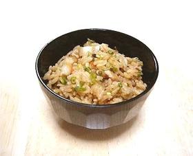 作り方は、豚だし汁と、鰹だし汁の合わせ出汁、短冊切り豚肉と、細かく刻んだ人参、椎茸、カマボコ(無くても良い)を準備して、炊き込みご飯の容量で作ります。蒸らしに、サラダ油少々(大さじ1くらい)を振り入れ、つやを出す。 炊き上がったら、青ネギを乗せて盛り付ける。