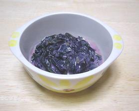 茹でたハンダマは黒くなってますが、酢の作用でアントシアニンの色素が色を増します。酢味噌和えしたハンダマをご飯に乗せると溶け出した汁で、ご飯がきれいな紫色に染まりますなります。(材料4人分を目安にしてます)