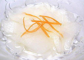 デークニ(大根)の酢の物です、旬の大根を細かく刻んで、甘酢をかけます。(写真は薄く短冊にしました)甘酢は、酢と水(薄めのだし汁でもよい)、砂糖を混ぜて作ります。ウサチ(前のブログ記事参照)より気持ち酸味を効かせます。 デークニナマシの彩りを気にしないのなら、醤油を数滴入れてもよし。 作ってすぐに食べるよりも、冷蔵庫でしばらく冷やしておくと、大根の汁と甘酢が溶け合い、いい味になります。