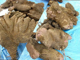 沖縄の山芋は、太くて短い大薯と呼ばれる種類で、別名ヤムイモ、ヤムまたは台湾ヤマイモと呼ばれているものです。山芋の生産が盛んな読谷村・うるま市では、ひとつの種芋からできた山芋の総重量などを競う「山芋スーブ」の産業祭りがあります。