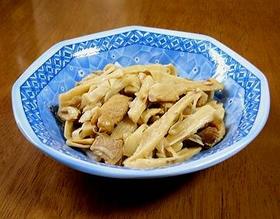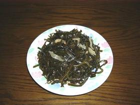 デークニ(大根)の炒め物。イリチーは炒めて、さらに煮詰める料理です。切干大根を戻し、千切りにした昆布、コンニャクを豚肉と一緒に炒めます。あっさりした味で、美味しいです。大根の代わりに干ぴょうを使うと、干ぴょうイリチーとなります。祝いの膳に、クーブイリチー、デークニイリチー、干ぴょうイリチーの何れか一つは小鉢に盛られて添えられます。