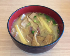 茹でて、油抜きをした豚の三枚肉、カマボコ(カステラカマボコがベター)、干し椎茸、油揚げ(または、厚揚の豆腐)、コンニャクが材料で、全て短冊切りにします。豚・鰹のだし汁、椎茸のもどし汁を合わせ白味噌を溶きます。そこへ具を全部入れて煮る。