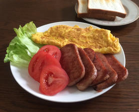 大衆食堂のメニューにもあるほど、沖縄ではなじみの料理?です。 少しだけ昔、学食に沖縄そばがあり、そばの具である三枚肉の代わりにポークがのっていて、安い学食ならではの沖縄そばでした。(今もあるかも)