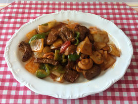 写真はチャップスイではなくチャップステーキ。ドライブインのメニューにあったので注文してみたら、嬉しいことにカットされた牛肉がゴロゴロと入っていた。