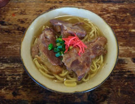 The ingredients for Okinawa soba are strong (or medium-strength) flour, salt, brine, or lye (the clear liquid of ashes). It is not common to make buckwheat noodles at home, but fresh noodles sold in supermarkets are used.There are various types of buckwheat noodles, including flat, thick, frizzled, and un-frizzled, and it is up to you to decide which you prefer. The most common type of noodle is a little thicker and lightly frizzled. The soup is made from pork bones and bonito stock, seasoned with salt and soy sauce.
